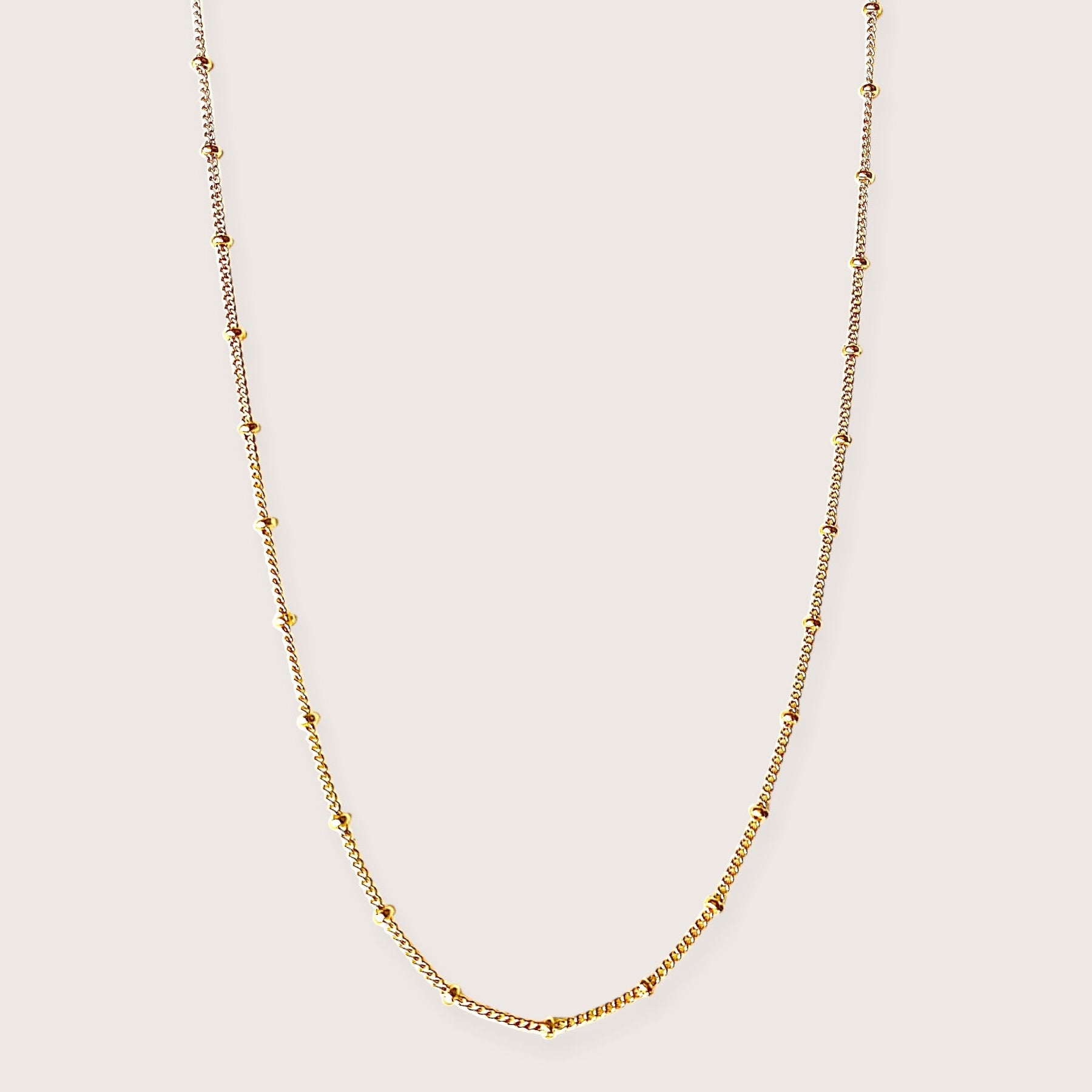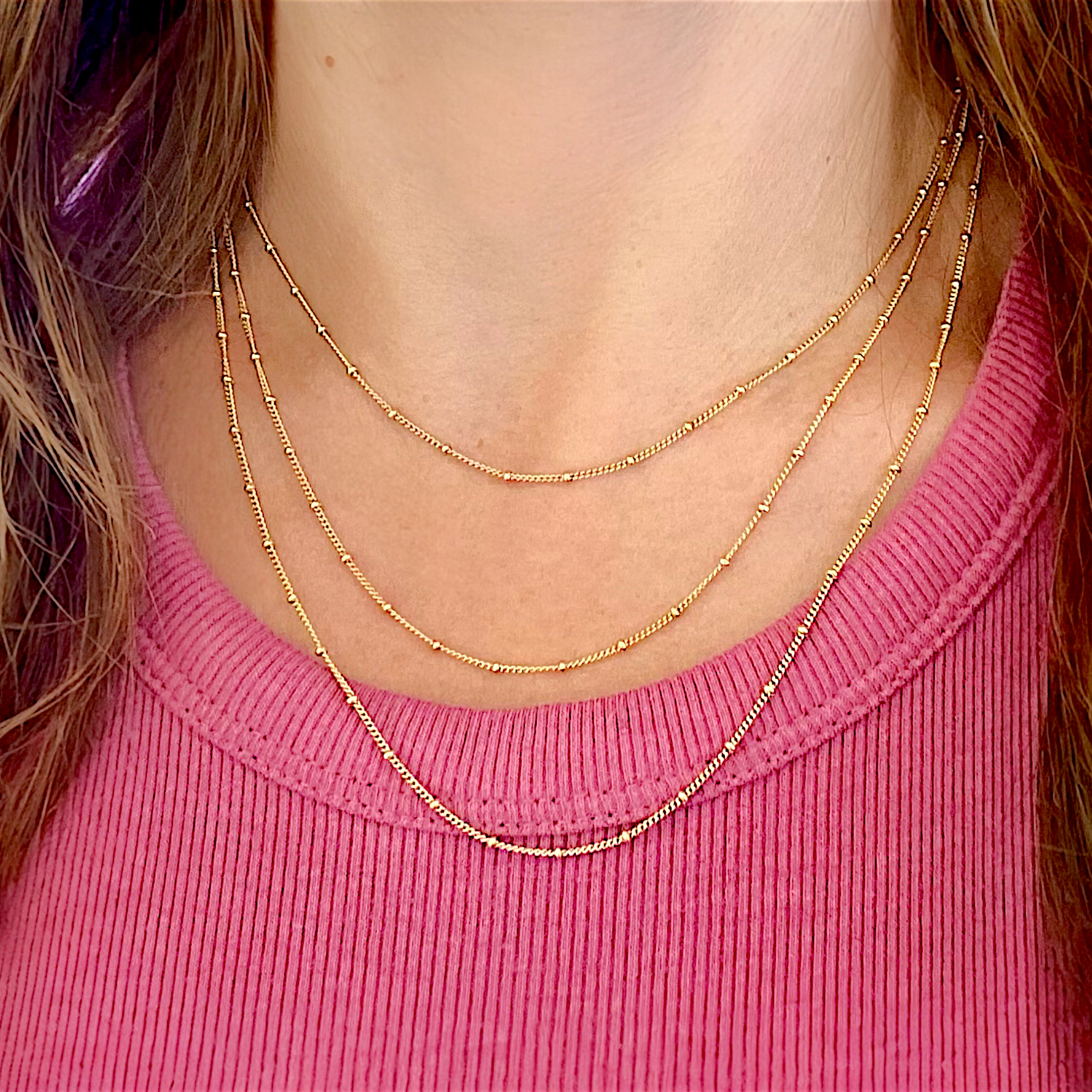 Our Dainty Satellite Bead Chains, are crafted from a high-quality 14K Yellow Gold Filled, offering a radiant, waterproof and non-tarnish finish that’s perfect for everyday wear. Designed with evenly stationed gold beads along a delicate yet durable curb style chain. This necklace is both minimalist and eye-catching—ideal for layering or wearing solo.