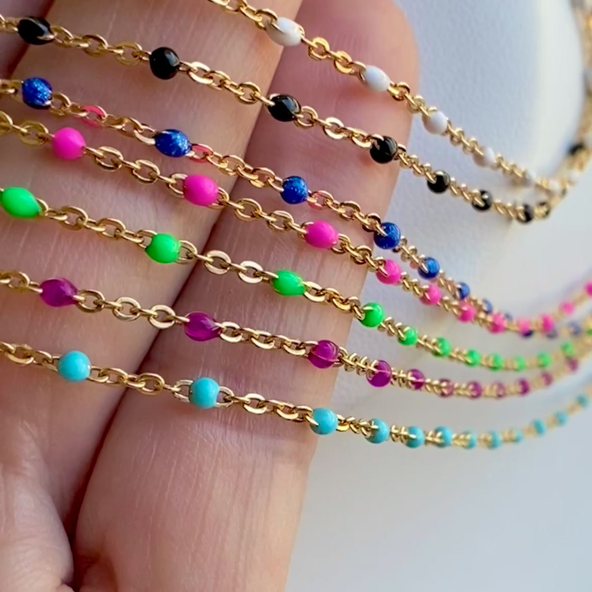 Our luxury-inspired Demi Fine Emerald Green Station Necklaces are meticulously crafted in high quality 14K Gold Filled, featuring lustrous resin enamel beads elegantly spaced along a premium water-safe gold-filled chain. The refined, minimalist design exudes high fashion and versatility, making it an ideal piece for sophisticated layering or a standalone statement that enhances any ensemble with understated elegance.