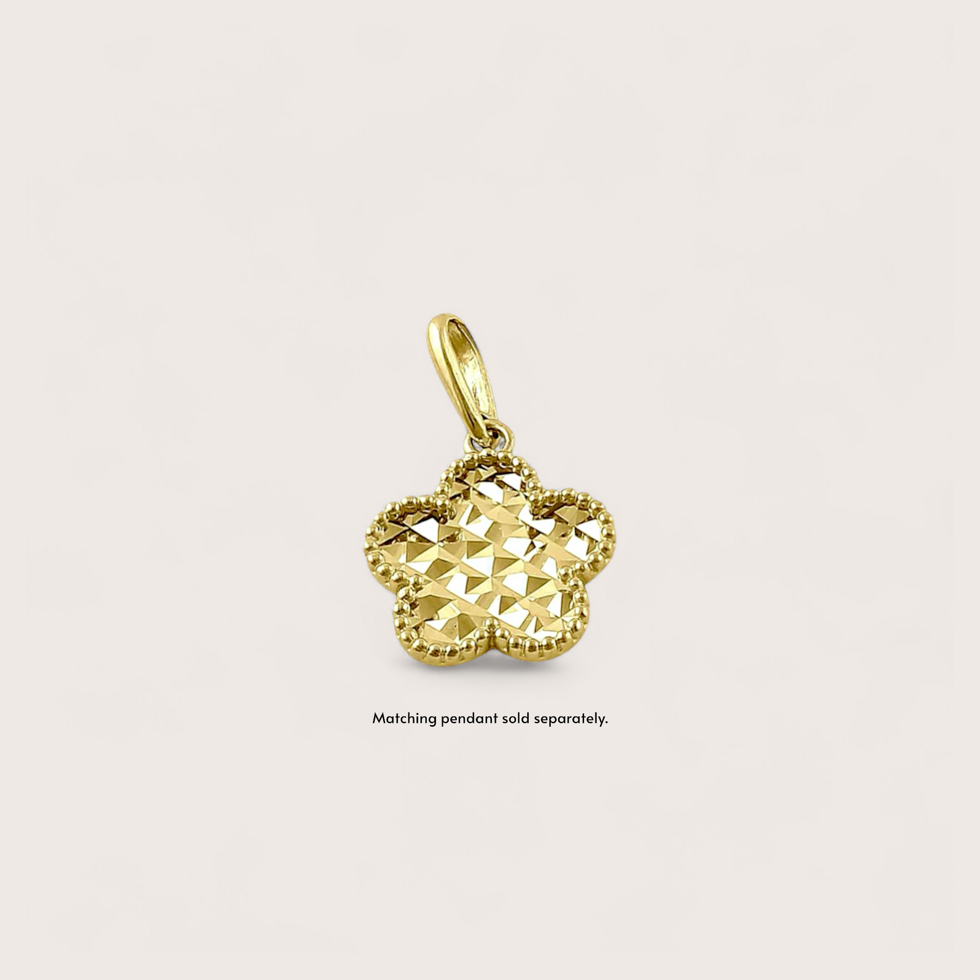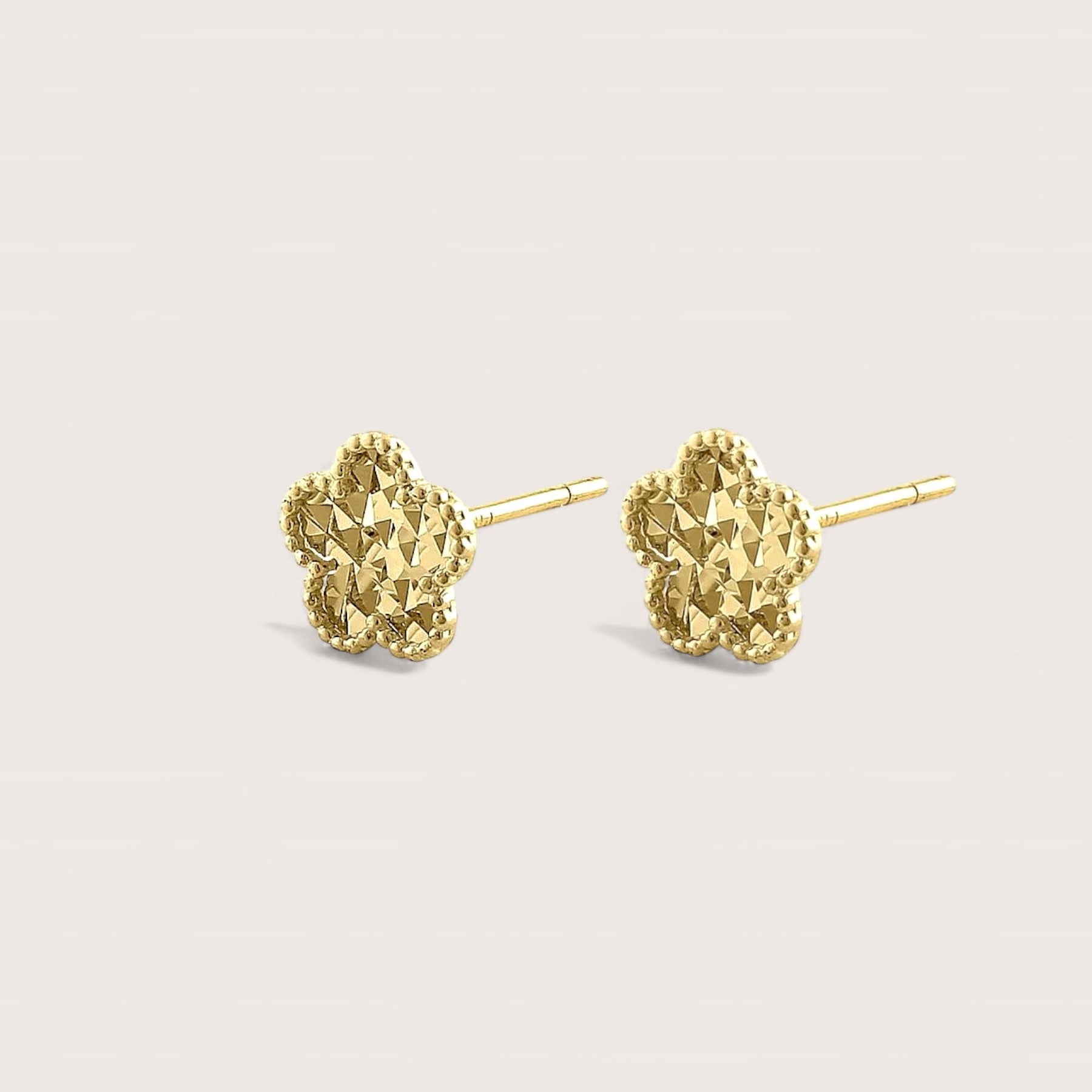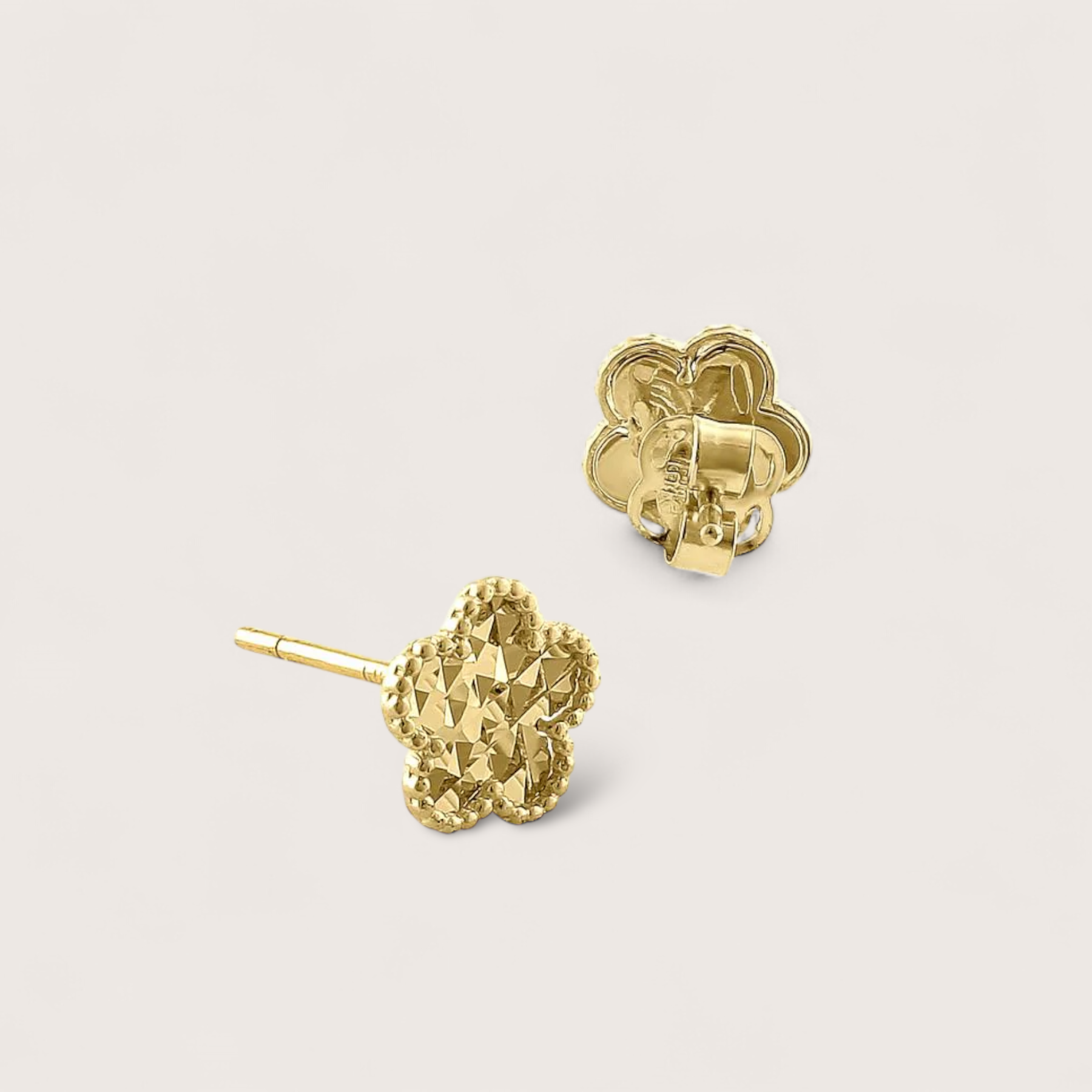 Clover Flower Stud Earrings - Solid 14K Yellow Gold, Diamond Cut Pattern