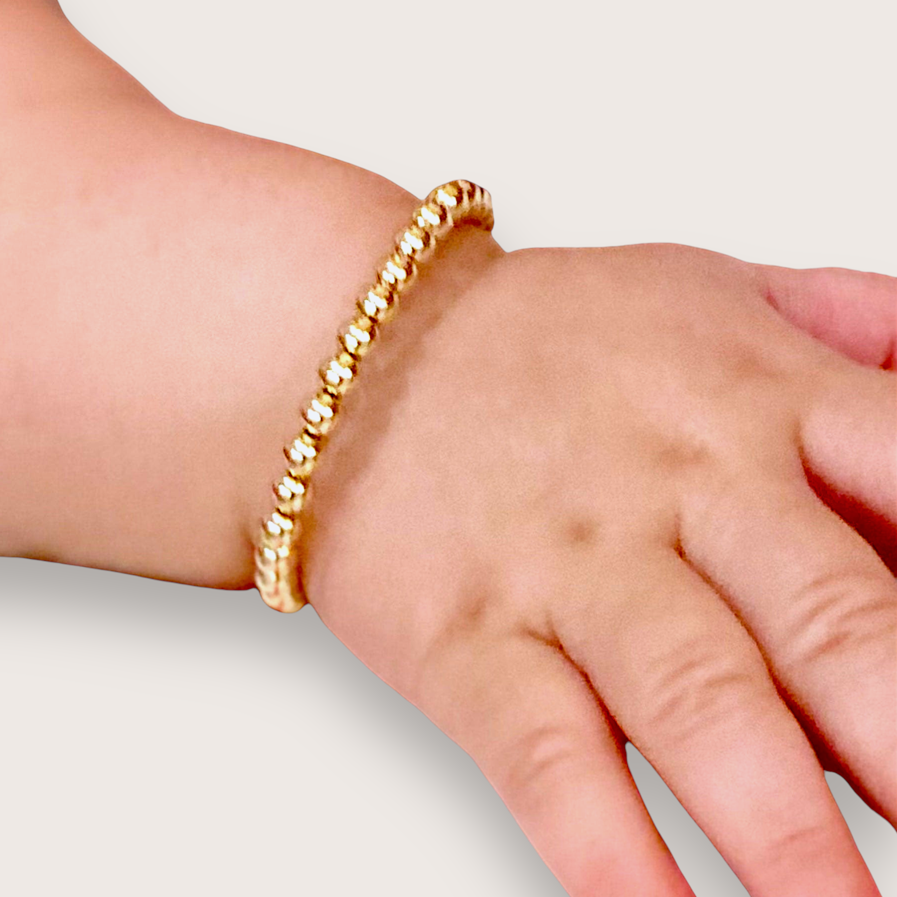 Give your little one the gift of style with our Gold Bead Baby Bracelet. These custom-sized bracelets are made with high-quality, hypoallergenic materials, ensuring that they are safe for sensitive skin. Plus, the non-tarnishing gold beads and stretch fit make it easy to put on and take off. Ethically sourced and tested for quality, your baby will be the trendiest kid on the block.*