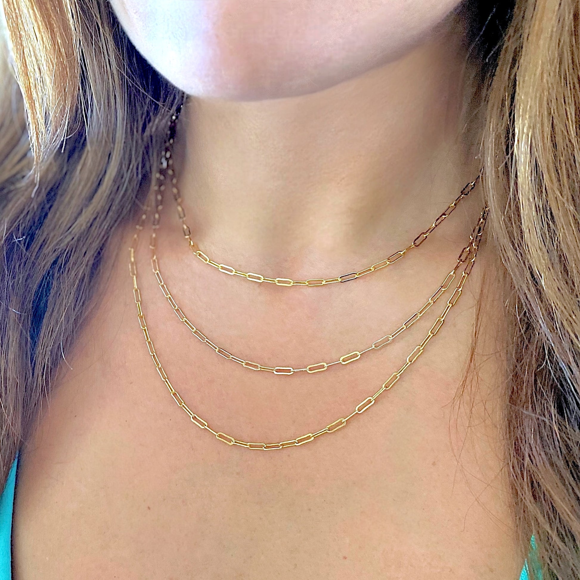 Elevate your jewelry collection with our exquisite Elegant Small Link Paperclip Chains. Crafted from 14K yellow gold filled, these versatile chains are ideal for everyday wear and can be effortlessly layered. These on-trend necklaces boast a timeless design that adds a touch of elegance to any outfit. Whether you’re gifting them or simply want to enhance your own style, these chains are sure to impress.
