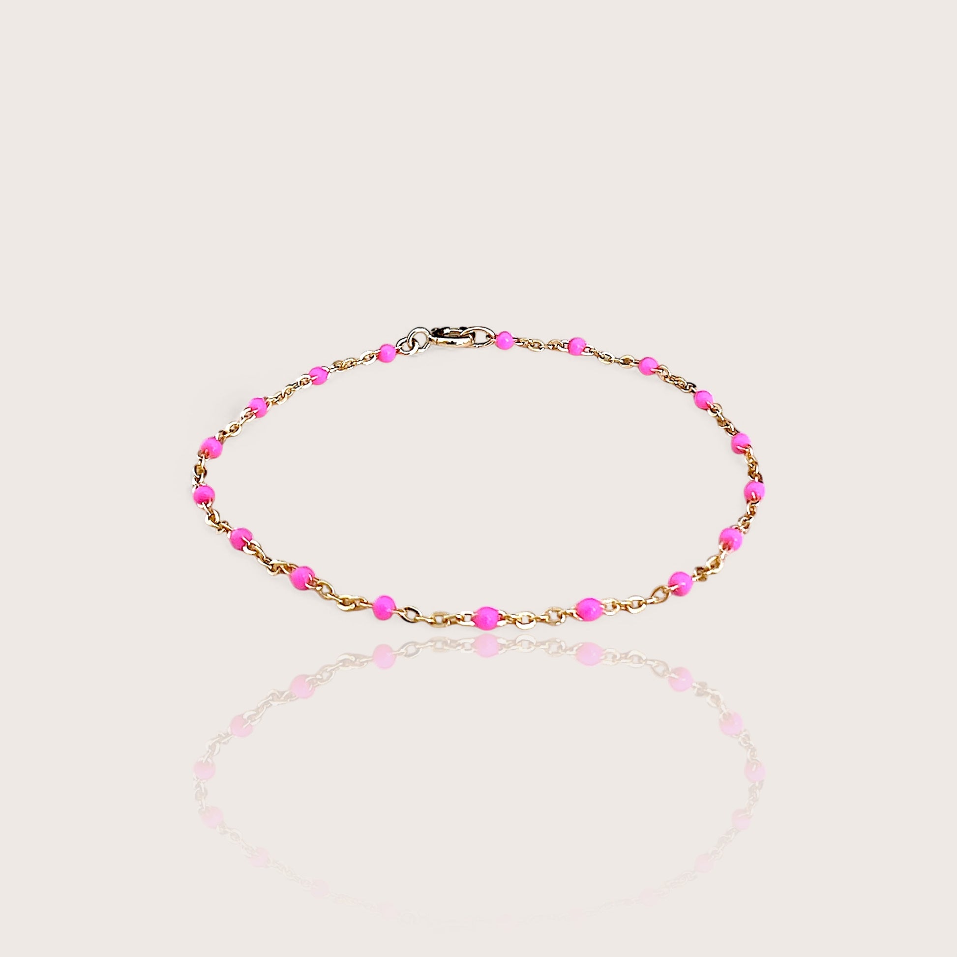 This delightful kids' bracelet features a shiny 14K gold-filled chain adorned with bright pink enamel beads, creating a playful, French-inspired look. Lightweight and comfortable, it’s perfect for stacking or wearing alone. Available in various lengths and bead colors, it’s also hypoallergenic and safe for sensitive skin, making it a fun and worry-free accessory for little ones.