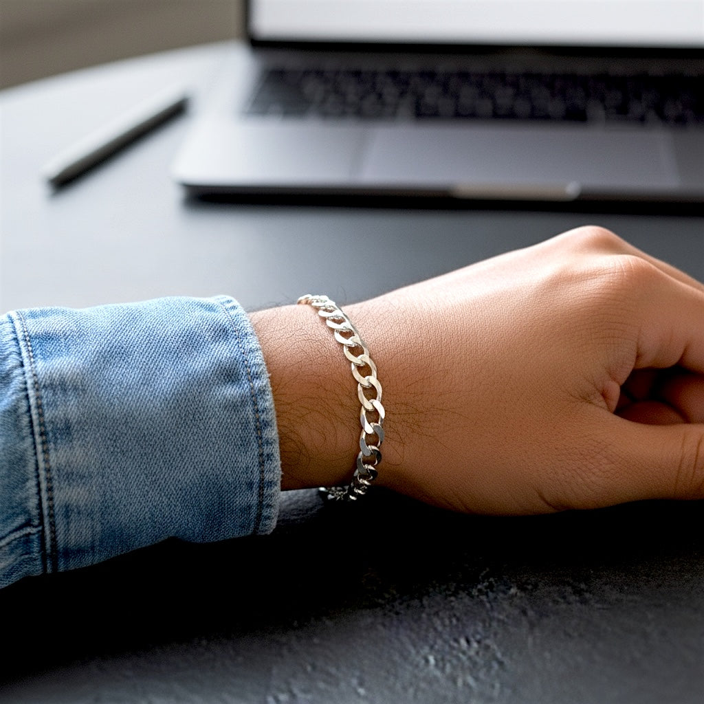 6mm Sterling Silver Flat Curb Chain Bracelet – Diamond Cut Links, Unisex Italian 925 Silver